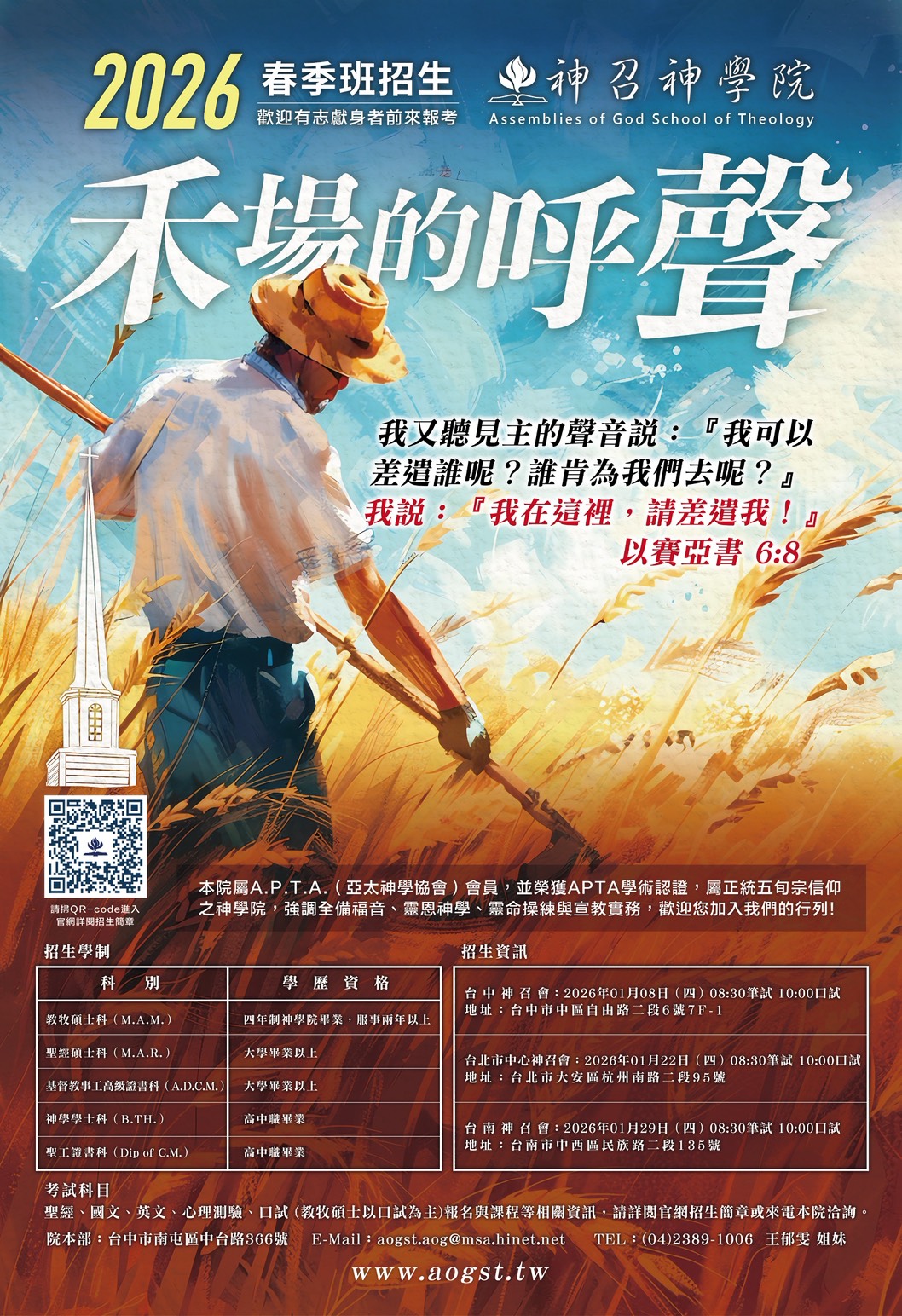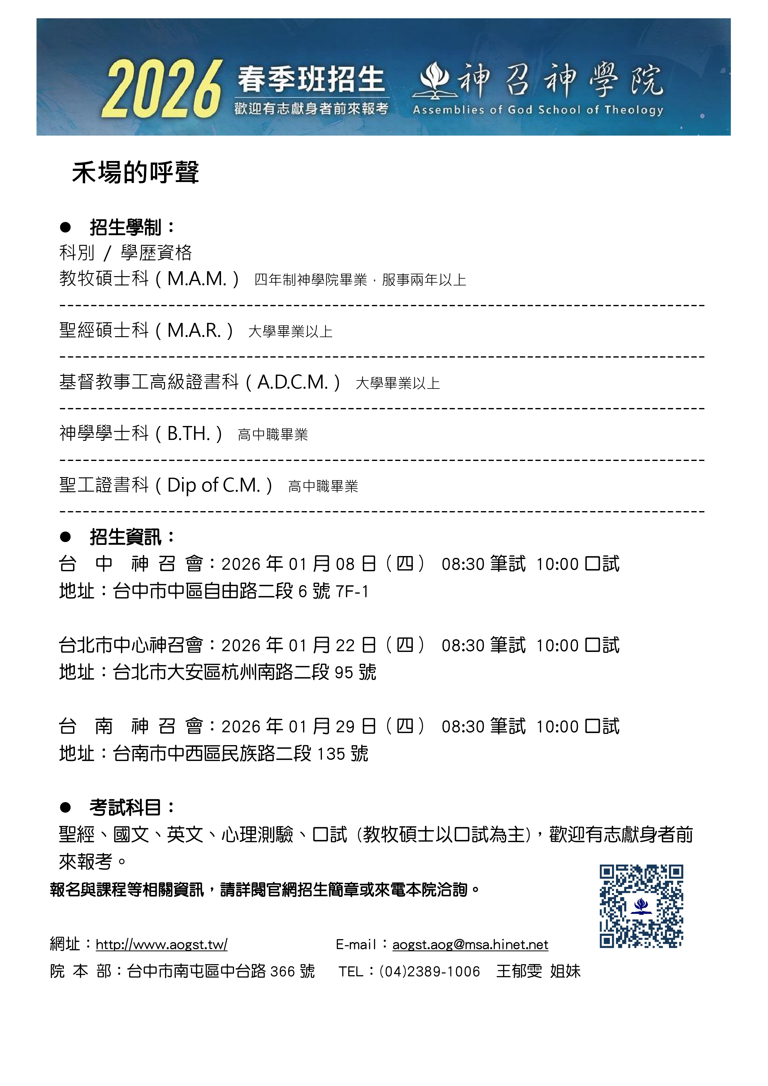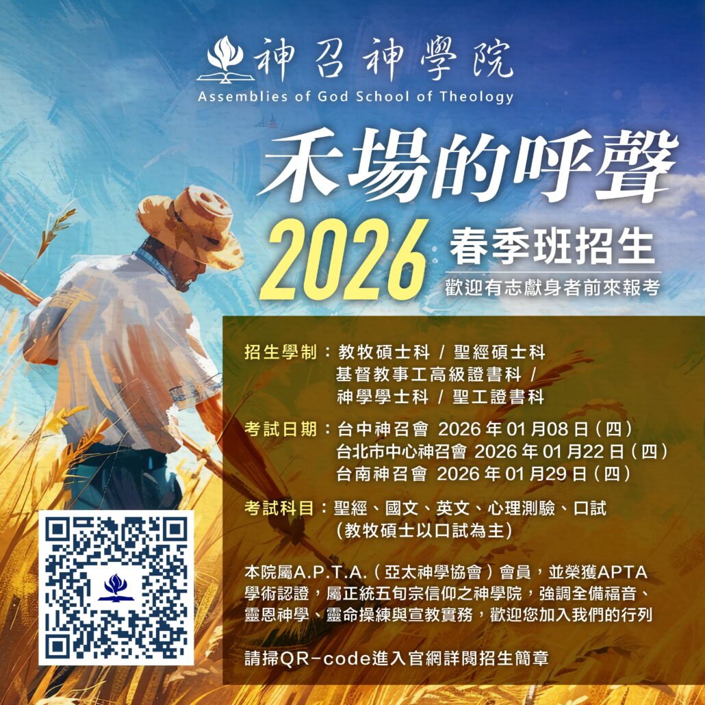 2026年 春季班課程 (招生中) 2025年1月17日/在: 春季班資訊 /通過: assistant ♥ 招生簡章:https://reurl.cc/j9Nndn ♥ https://www.aogst.tw/wp-content/uploads/2025/12/1040x1040.jpg 4333 4333 assistant http://www.aogst.tw/wp-content/uploads/2017/06/神召神學院標準字logo向量轉-300x72.png assistant2025-01-17 09:27:192025-12-18 15:26:122026年 春季班課程 (招生中)